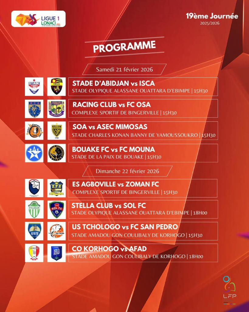 Samedi, le championnat reprend ses droits avec une affiche qui sent la pression et l’urgence. À l’occasion de la 19e journée de Ligue 1, le Stade d’Abidjan accueille ISCA au stade Alassane Ouattara d’Ebimpé. Deux équipes touchées la semaine passée, deux équipes qui n’ont plus vraiment le luxe de calculer. Dans ce genre de contexte, le classement compte, mais l’état d’esprit pèse souvent encore plus lourd.