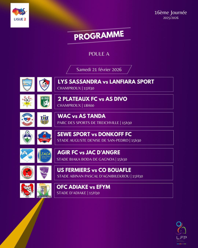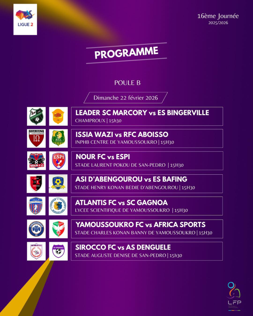 La Ligue 2 ivoirienne reprend ses droits ce week-end avec une 16e journée qui sent la poudre. Entre leaders qui reçoivent des adversaires sous pression et une grosse affiche attendue au pied de la Basilique, le programme promet des débats engagés et des enjeux bien clairs.